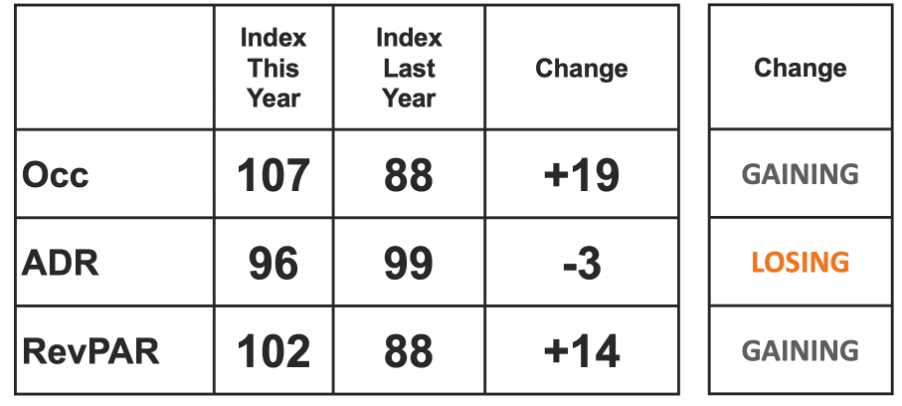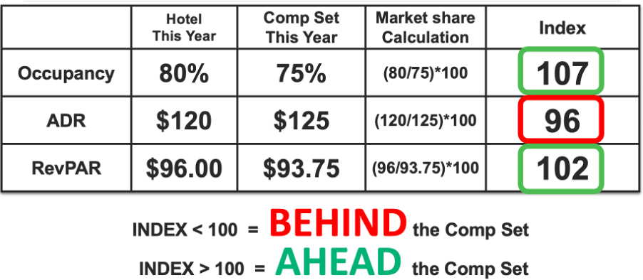 While if the index is below 100 it means that the competitive set is outperforming the subject property, and the subject property is underperforming.